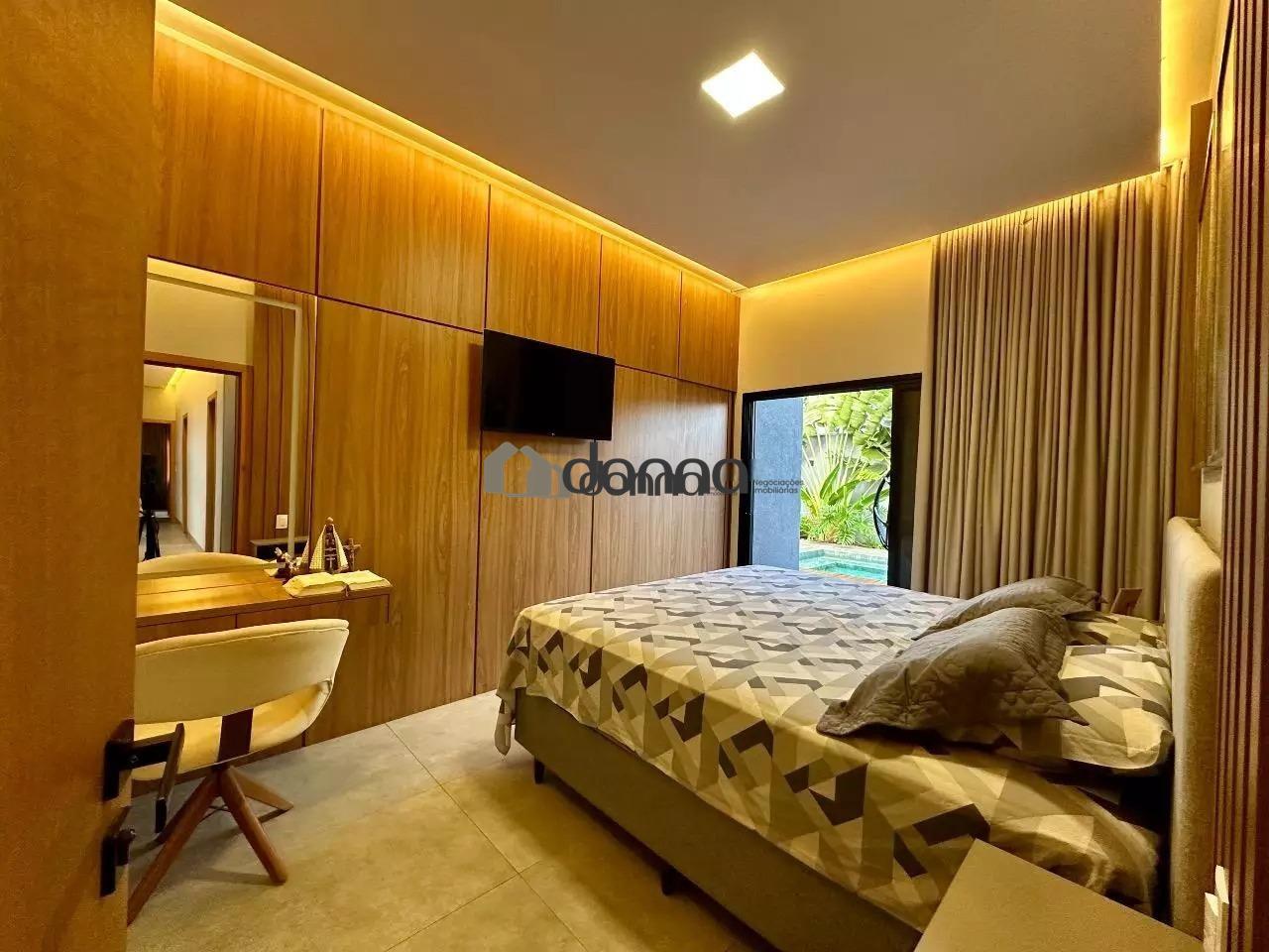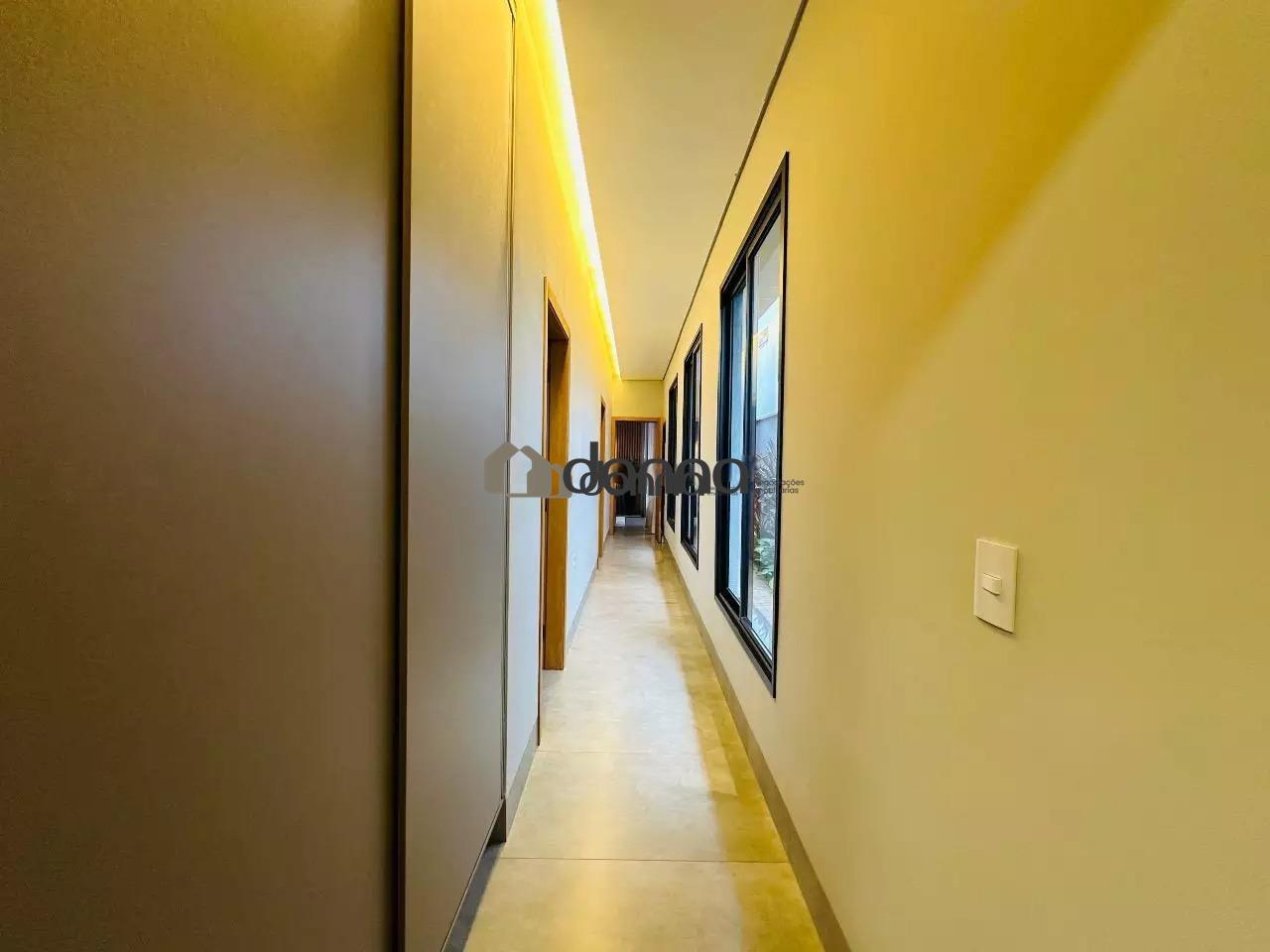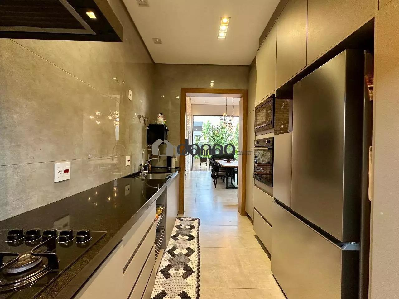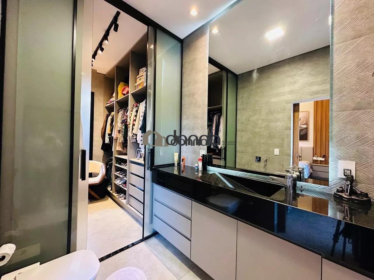 03 suítes, sendo uma máster com 02 closets e ar condicionado na 03 suítes, banheiro social em fino acabamento, Lavabo, sala para 02 ambientes com pé direito duplo, cozinha com planejados, lavanderia com planejado, área gourmet integra com churrasqueira e som ambiente iluminação em led e cortina automatizada, Piscina aquecida com deck e boiler de madeira, estendal nos fundos da casa, armário em metal para depósito no corredor lateral, garagem para 02 veículos na área coberta e 02 veículos na área descoberta. Localização bem localizada no condomínio.